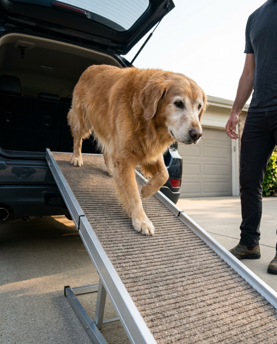 "Rosie is twelve now. Golden Retriever. For two years I lifted her into my SUV by myself — twice a week for her arthritis appointments, every groomer visit, every trip to the park we used to take together on Sundays. I tried two ramps in that time. Both trained perfectly on the ground. Both failed at the car. I thought it was her. I thought it was my training. I returned both and went back to lifting with a back that was starting to have opinions about it. Then I found out about the angle. The ramps I bought were creating thirty-seven degrees against my tailgate. Rosie's arthritic hips had a ceiling below that. Her nervous system was stopping her every time — correctly. The Pawtiva creates twenty-five degrees. She walked up on day four. I stood in the driveway alone and I just — stayed there for a while. We went to the park that Sunday for the first time in eight months. She still knows where we are when we pull into the car park. She still walks to the ramp when I set it up. She still wants to go everywhere. I just finally gave her a way to get there that her body could actually manage. I no longer worry before every outing. That's worth more than I can explain."
